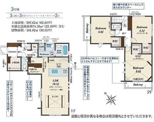 | 間取り | 3LDK 間取り内訳:リビングダイニングキッチン 19.5帖(1階)・洋室 8帖(2階)・洋室 6.5帖(2階)・洋室 6帖(2階) |