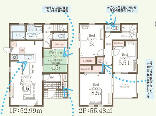 | 間取り | 4LDK 間取り内訳:リビングダイニングキッチン 16帖(1階)・和室 4.5畳(1階)・洋室 8.5帖(2階)・洋室 6帖(2階)・洋室 5.5帖(2階) |