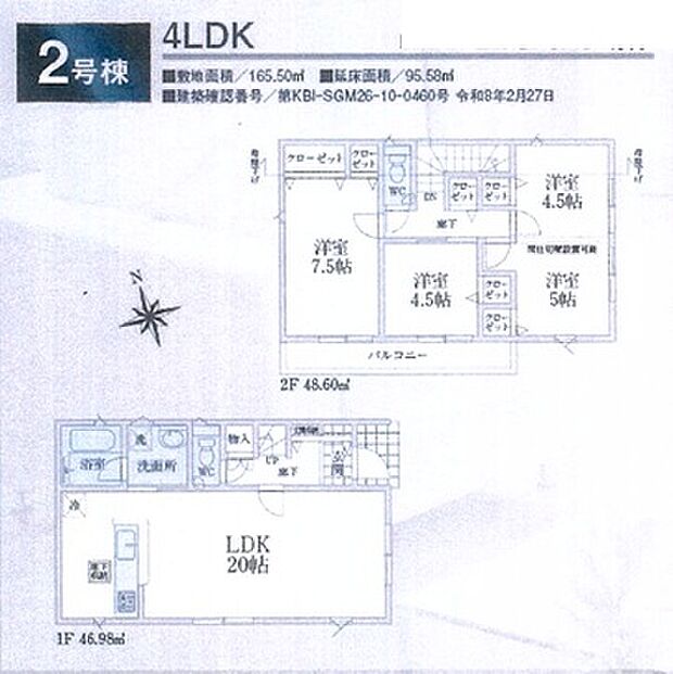 | 間取り | 3LDK(将来4LDKに対応可。) 間取り内訳:リビングダイニングキッチン 20帖(1階)・洋室 4.5帖(2階)・洋室 7.5帖(2階)・洋室 9.5帖(2階) |