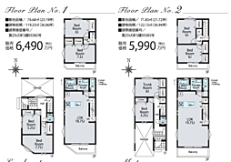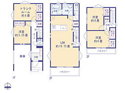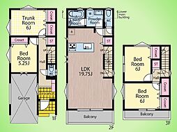| 間取り | 3SLDK 間取り内訳:収納 6帖(1階)・洋室 5.2帖(1階)・リビングダイニングキッチン 19.7帖(2階)・洋室 6帖(3階)x2 |