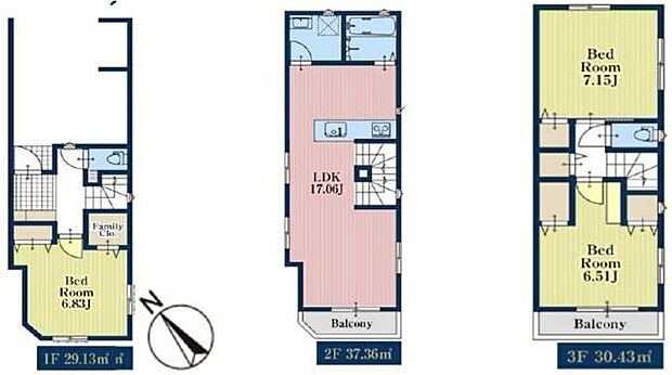 間取り内訳:洋室 6.8帖(1階)・リビングダイニングキッチン 17帖(2階)・洋室 7.1帖(3階)・洋室 6.5帖(3階)