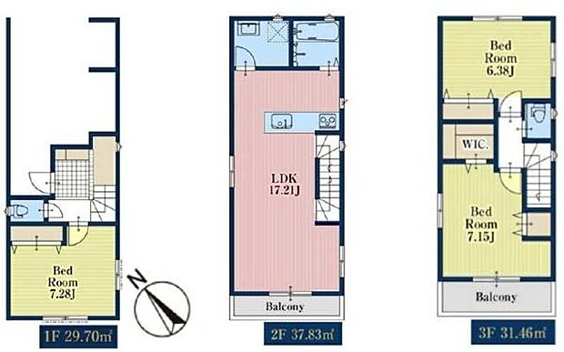 間取り内訳:洋室 7.2帖(1階)・リビングダイニングキッチン 17.2帖(2階)・洋室 7.1帖(3階)・洋室 6.3帖(3階)
