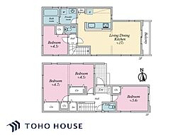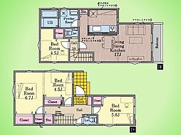 | 間取り | 3LDK 間取り内訳:洋室 11.2帖(1階)・洋室 5.6帖(1階)・リビングダイニングキッチン 17帖(2階)・洋室 4.5帖(2階) |