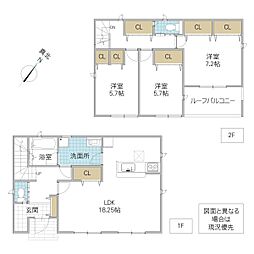 間取り内訳:リビングダイニングキッチン 18.2帖(1階)・洋室 7.2帖(2階)・洋室 5.7帖(2階)x2