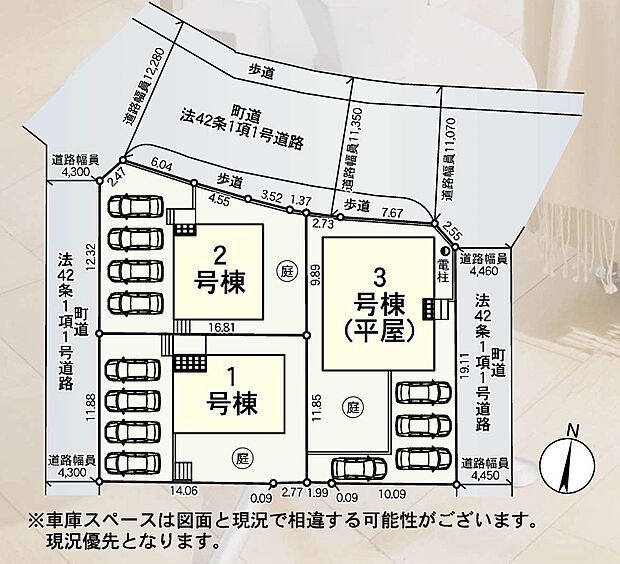 1号棟:西4.3m /2号棟:西4.3m 北11.3m /3号棟:北11.6m 東4.4m