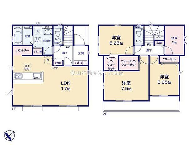 間取り内訳:リビングダイニングキッチン 17帖(1階)・洋室 7.5帖(2階)・洋室 5.2帖(2階)・洋室 5.2帖(2階)・収納 3帖(2階)