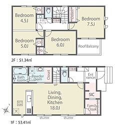 | 間取り | 4LDK 間取り内訳:リビングダイニングキッチン 18帖(1階)・洋室 7.5帖(2階)・洋室 6帖(2階)・洋室 5帖(2階)・洋室 4.5帖(2階) |