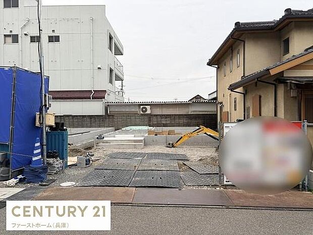 • 建築中の現場の様子が確認できる写真です。周囲には住宅が立ち並び落ち着いた雰囲気が感じられます。敷地内には重機もあり着々と工事が進行しています。前面道路も整備されており利便性が期待できます。