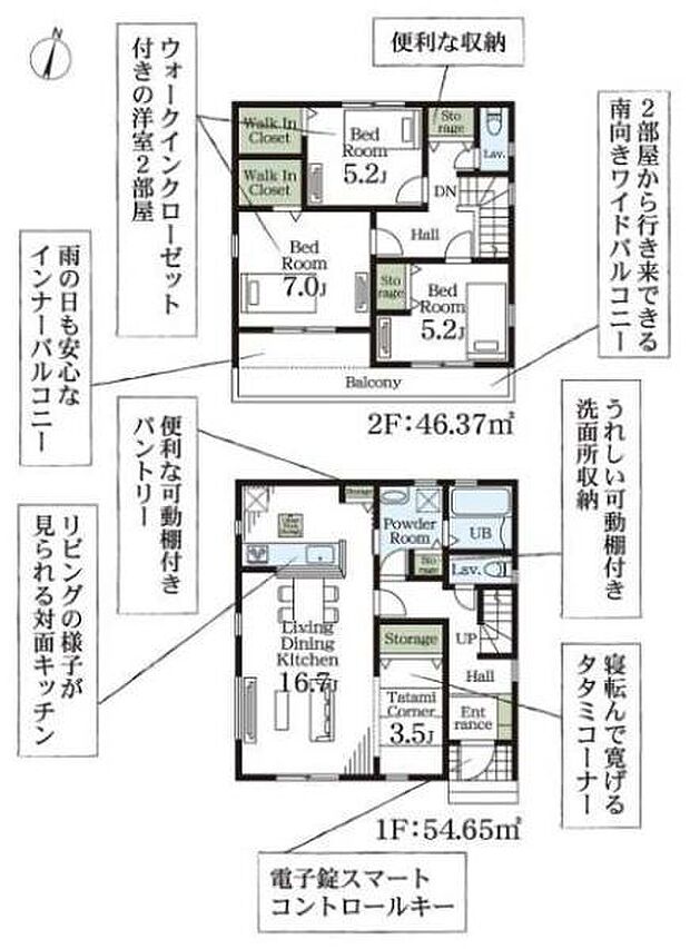 間取り内訳:リビングダイニングキッチン 16.7帖(1階)・和室 3.5畳(1階)・洋室 7帖(2階)・洋室 5.2帖(2階)・洋室 5.2帖(2階)