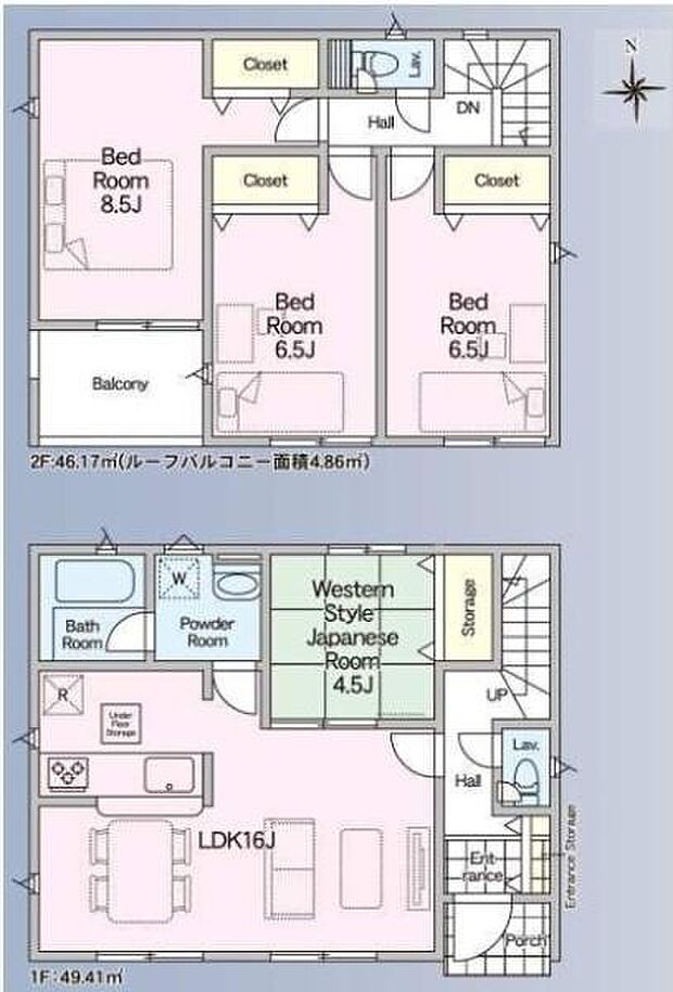 間取り内訳:リビングダイニングキッチン 16帖(1階)・和室 4.5畳(1階)・洋室 8.5帖(2階)・洋室 6.5帖(2階)・洋室 6.5帖(2階)