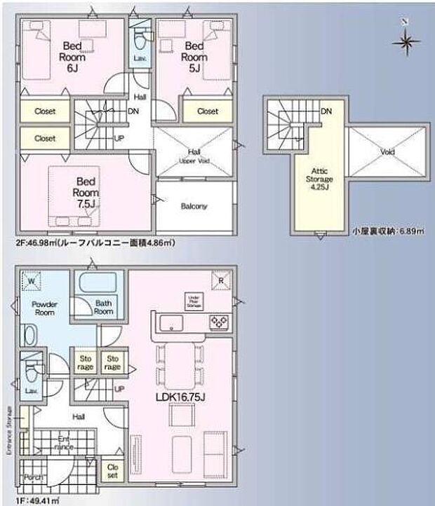 | 間取り | 3LDK 間取り内訳:リビングダイニングキッチン 16.7帖(1階)・洋室 7.5帖(2階)・洋室 6帖(2階)・洋室 5帖(2階) |