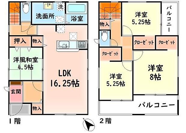 | 間取り | 4LDK 間取り内訳:リビングダイニングキッチン 16.2帖(1階)・和室 4.5畳(1階)・洋室 8帖(2階)・洋室 5.2帖(2階)・和室 5.2畳(2階) |
