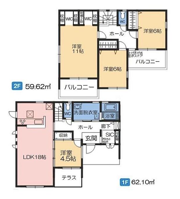 | 間取り | 4LDK 間取り内訳:リビングダイニングキッチン 18帖(1階)・洋室 4.5帖(1階)・洋室 11帖(2階)・洋室 6帖(2階)・洋室 6帖(2階) |