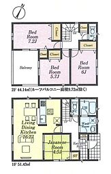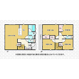| 間取り | 4LDK(ルーフバルコニー:8.51?) 間取り内訳:リビングダイニングキッチン 16.5帖(1階)・和室 4.5畳(1階)・洋室 6帖(2階)・洋室 6.5帖(2階)・洋室 8帖(2階) |