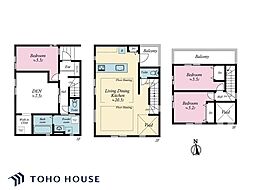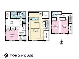 | 間取り | 3SLDK 間取り内訳:リビングダイニングキッチン 18.7帖(2階)・洋室 6.8帖(1階)・収納 6.5帖(1階)・洋室 5.3帖(3階)・洋室 5.3帖(3階) |