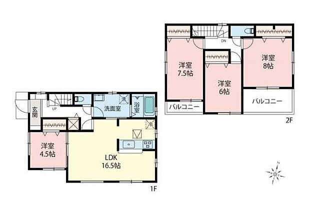 間取り内訳:リビングダイニングキッチン 16.5帖(1階)・洋室 4.5帖(1階)・洋室 8帖(2階)・洋室 7.5帖(2階)・洋室 6帖(2階)