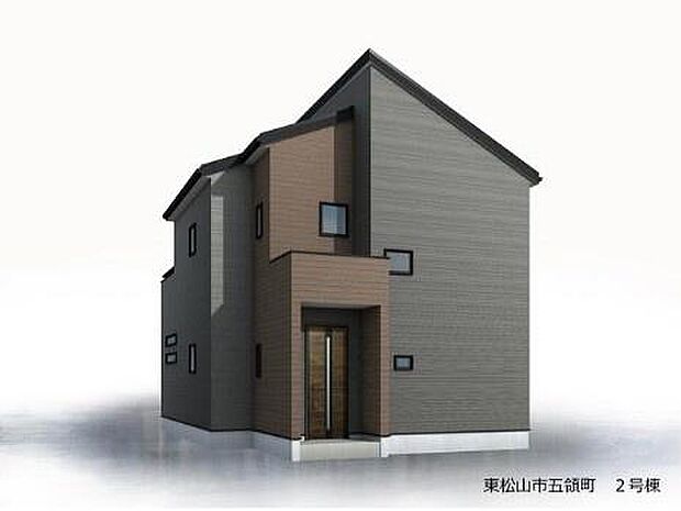 • 【2号棟外観完成予想図】個性が際立つ、モダンフォルムの新築分譲住宅 全3棟。ダークトーンに映える木の温もりが存在感のあるデザインです。