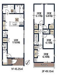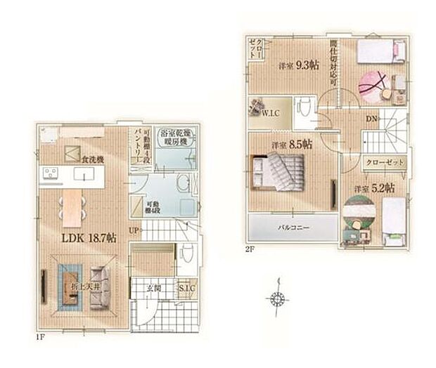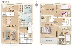 | 間取り | 3LDK 間取り内訳:リビングダイニングキッチン 18.7帖(1階)・洋室 9.3帖(2階)・洋室 8.5帖(2階)・洋室 5.2帖(2階) |