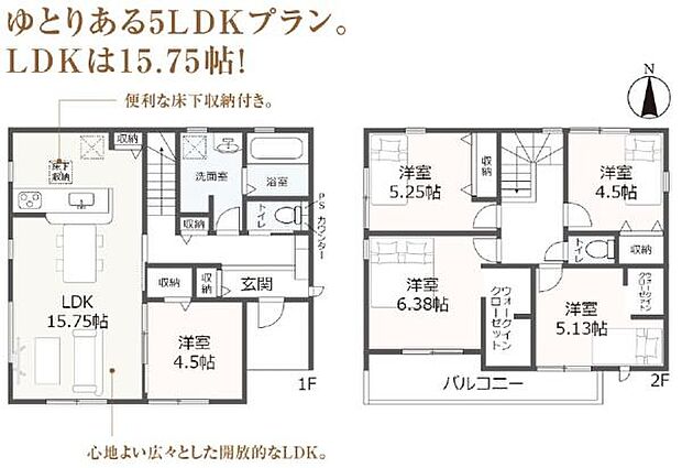 | 間取り | 5LDK 間取り内訳:リビングダイニングキッチン 15.7帖(1階)・洋室 4.5帖(1階)・洋室 6.3帖(2階)・洋室 5.2帖(2階)・洋室 5.1帖(2階)・洋室 4.5帖(2階) |