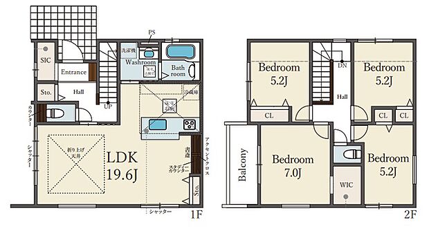 | 間取り | 4LDK 間取り内訳:リビングダイニングキッチン 19.6帖(1階)・洋室 5.2帖(2階)x3・洋室 7帖(2階) |
