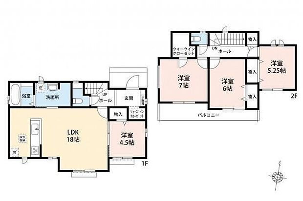 間取り内訳:リビングダイニングキッチン 18帖(1階)・洋室 4.5帖(1階)・洋室 7帖(2階)・洋室 6帖(2階)・洋室 5.2帖(2階)