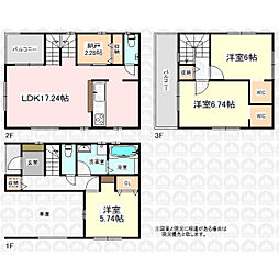 | 間取り | 3SLDK 間取り内訳:洋室 5.7帖(1階)・リビングダイニングキッチン 17.2帖(2階)・収納 2.2帖(2階)・洋室 6.7帖(3階)・洋室 6帖(3階) |