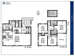 | 間取り | 4LDK 間取り内訳:リビングダイニングキッチン 20帖(1階)・洋室 6.7帖(2階)・洋室 5.2帖(2階)・洋室 4.5帖(2階)・洋室 4.5帖(2階) |