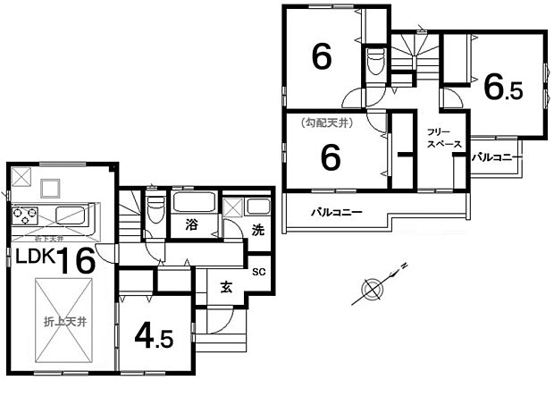 間取り内訳:リビングダイニングキッチン 16帖(1階)・洋室 4.5帖(1階)・洋室 6帖(2階)x2・洋室 6.5帖(2階)