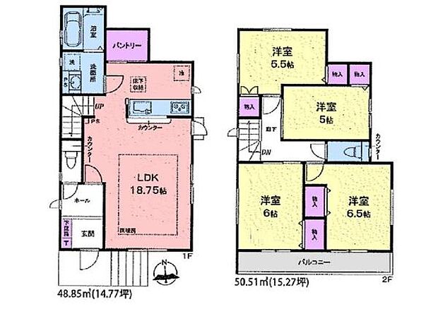 | 間取り | 4LDK 間取り内訳:リビングダイニングキッチン 18.7帖(1階)・洋室 6.5帖(2階)・洋室 6帖(2階)・洋室 5.5帖(2階)・洋室 5帖(2階) |