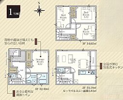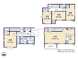 | 間取り | 4LDK 間取り内訳:洋室 7帖(1階)・リビングダイニングキッチン 18.1帖(2階)・洋室 5.3帖(3階)・洋室 5帖(3階)・洋室 4.5帖(3階) |