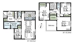 | 間取り | 4LDK 間取り内訳:リビングダイニングキッチン 15.7帖(1階)・洋室 3帖(1階)・洋室 5.3帖(2階)・洋室 8帖(2階)・洋室 6.5帖(2階) |