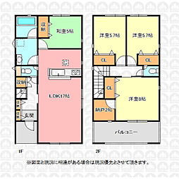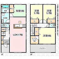 | 間取り | 4LDK(テレワークルーム:2帖) 間取り内訳:リビングダイニングキッチン 17帖(1階)・和室 5畳(1階)・洋室 5.7帖(2階)・洋室 5.7帖(2階)・洋室 8帖(2階) |