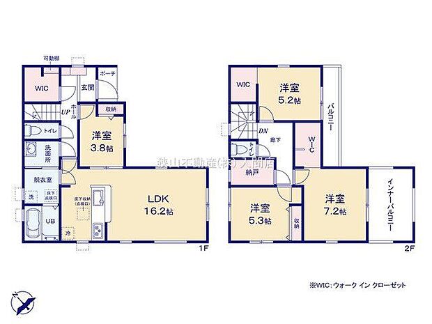 | 間取り | 4SLDK 間取り内訳:リビングダイニングキッチン 16.2帖(1階)・洋室 3.8帖(1階)・洋室 7.2帖(2階)・洋室 5.3帖(2階)・洋室 5.2帖(2階)・収納(2階) |