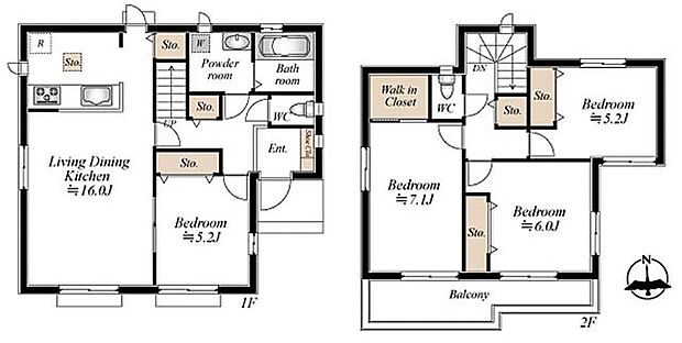 間取り内訳:リビングダイニングキッチン 16帖(1階)・洋室 5.2帖(1階)・洋室 7.1帖(2階)・洋室 6帖(2階)・洋室 5.2帖(2階)