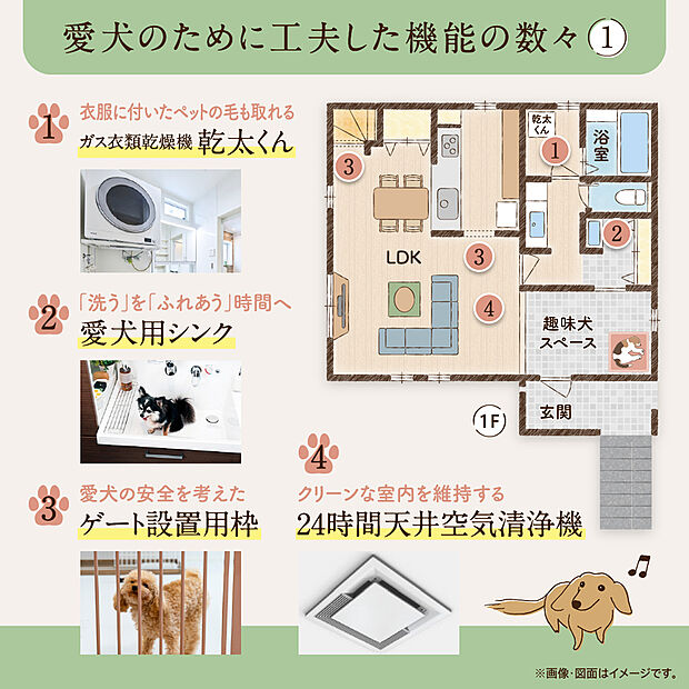 愛犬と家族が心地よく暮らせるよう、動線や設備に配慮した家。日々のふれあいを大切にしながら、快適で楽しい毎日を叶えます。 ◆愛犬のために工夫した機能の数々◆ ▼暮らしをより清潔で快適に…消臭クロス/ガス衣類乾燥機「乾太くん」/天井空気清浄機 ▼IoTで叶える安心…見守りIoTカメラ/温度・湿度センサー/犬用フロア ◆生活施設が充実し、暮らしやすいエリア◆・西鉄バス「有田一丁目」停…徒歩2分・西鉄バス「井開」停…徒歩3分・にしてつストア有田店…徒歩9分・イオン原店…車で2分・木の葉モール橋本…車で3