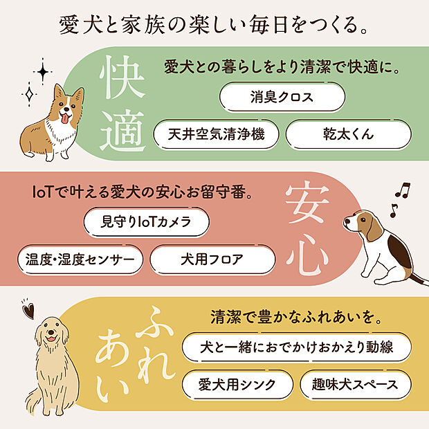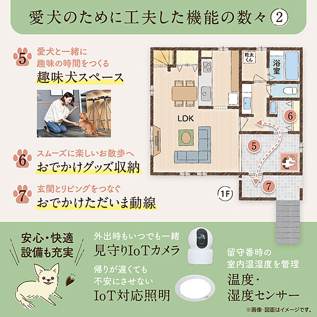 愛犬と家族が心地よく暮らせるよう、動線や設備に配慮した家。日々のふれあいを大切にしながら、快適で楽しい毎日を叶えます。 ◆愛犬のために工夫した機能の数々◆ ▼暮らしをより清潔で快適に…消臭クロス/ガス衣類乾燥機「乾太くん」/天井空気清浄機 ▼IoTで叶える安心…見守りIoTカメラ/温度・湿度センサー/犬用フロア ◆生活施設が充実し、暮らしやすいエリア◆・西鉄バス「有田一丁目」停…徒歩2分・西鉄バス「井開」停…徒歩3分・にしてつストア有田店…徒歩9分・イオン原店…車で2分・木の葉モール橋本…車で3