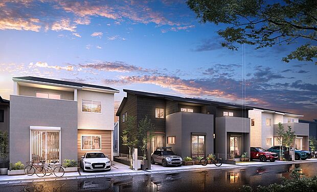 • 外構やアプローチに配した灯りが連なり、夕景の街並みにやさしい明るさを描く風景。夜の時間帯も心地よく過ごせる住環境です。〈Prime Court街区〉(2026年1月撮影)