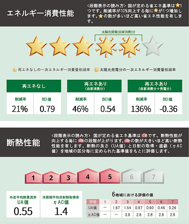 星マークの数が多いほどエネルギー消費性能が高いことを示しています。再エネ設備のない住宅は★0~★4の5段階評価、再エネ設備がある住宅は★0~★6の7段階評価となります。