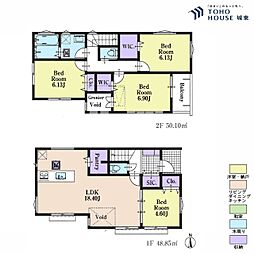 | 間取り | 4LDK(パントリー、WIC、SIC、小屋裏収納付き) 間取り内訳:リビングダイニングキッチン 18.4帖(1階)・洋室 4.6帖(1階)・洋室 6.9帖(2階)・洋室 6.1帖(2階)x2 |