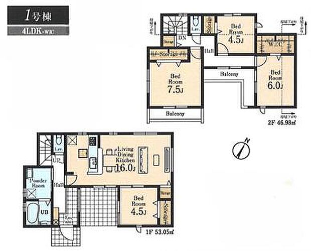 | 間取り | 4LDK 間取り内訳:リビングダイニングキッチン 16帖(1階)・洋室 4.5帖(1階)・洋室 7.5帖(2階)・洋室 6帖(2階)・洋室 4.5帖(2階) |