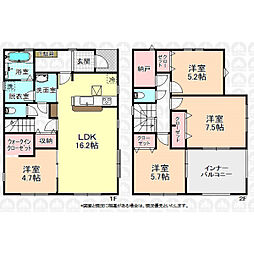間取り内訳:リビングダイニングキッチン 18.2帖(1階)・洋室 7帖(2階)・洋室 5.3帖(2階)・洋室 5.2帖(2階)・洋室 3帖(1階)