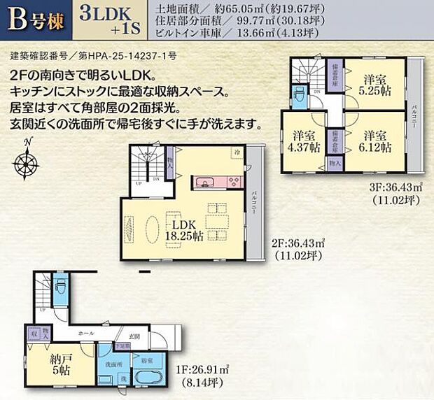 | 間取り | 3SLDK 間取り内訳:収納 5帖(1階)・リビングダイニングキッチン(2階)・洋室 6.1帖(3階)・洋室 5.2帖(3階)・洋室 4.3帖(3階) |