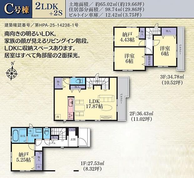 | 間取り | 2LDK 間取り内訳:収納 5.2帖(1階)・リビングダイニングキッチン(2階)・洋室 6帖(3階)x2・洋室 4.4帖(3階) |