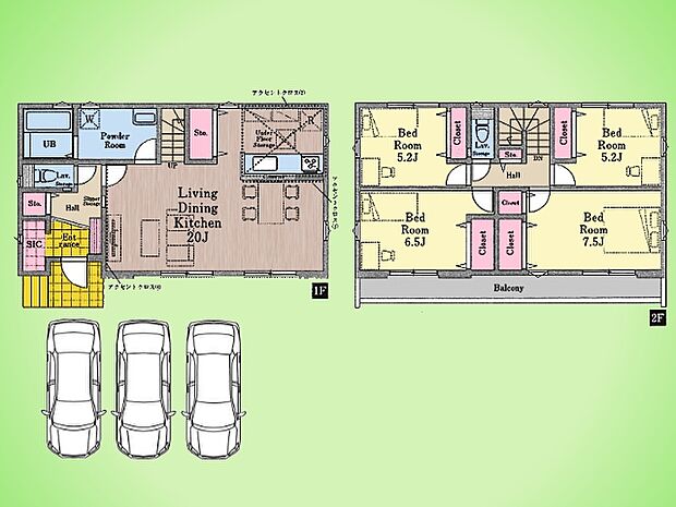 カースペース3台可(車種による) シューズインクローゼット リビングイン階段 LDK20帖 アクセントクロス 各居室収納スペース付き ハンドシャワー付洗面台 食洗機 浄水器 シャッター ウォシュレット