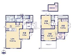 | 間取り | 4LDK 間取り内訳:リビングダイニングキッチン 16.8帖(1階)・洋室 4.5帖(1階)・洋室 6帖(2階)・洋室 5.2帖(2階)・洋室 9.8帖(2階) |