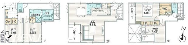 間取り内訳:リビングダイニングキッチン 18.8帖(2階)・洋室 6帖(3階)・洋室 6帖(3階)・収納 5.2帖(1階)・収納 5帖(1階)