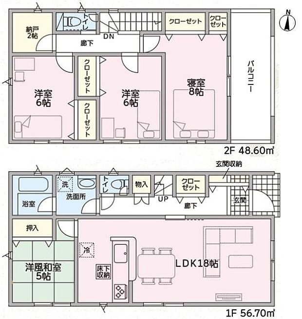 | 間取り | 4SLDK 間取り内訳:リビングダイニングキッチン 18帖(1階)・和室 5畳(1階)・洋室 8帖(2階)・洋室 6帖(2階)・洋室 6帖(2階)・収納 2帖(2階) |