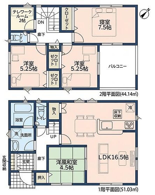 | 間取り | 4SLDK 間取り内訳:リビングダイニングキッチン 16.5帖(1階)・和室 4.5畳(1階)・洋室 7.5帖(2階)・洋室 5.2帖(2階)・洋室 5.2帖(2階)・収納 2帖(2階) |