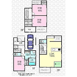 | 間取り | 3LDK 間取り内訳:洋室 6帖(1階)・リビングダイニングキッチン 16帖(2階)・洋室 6帖(3階)x2 |