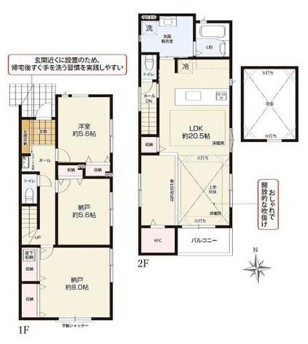 間取り内訳:洋室 5.6帖(1階)・収納 5.6帖(1階)・収納 8帖(1階)・リビングダイニングキッチン 20.5帖(2階)